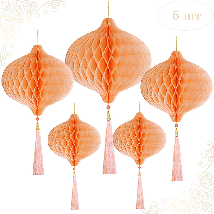 НАБОР бумажное украшение Шары-соты с кисточкой, персиковый - 5шт: