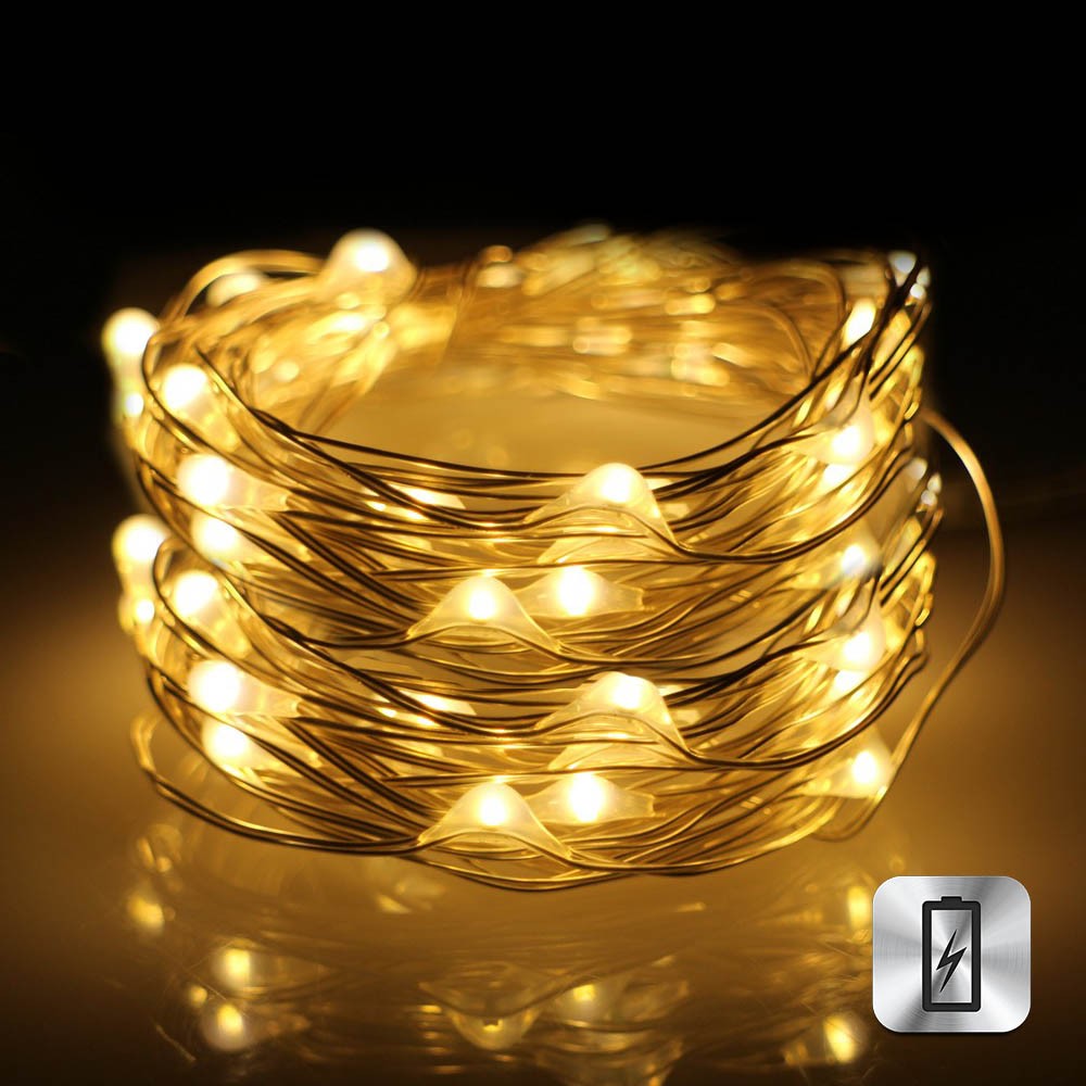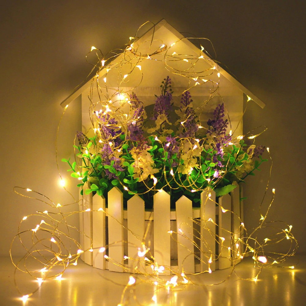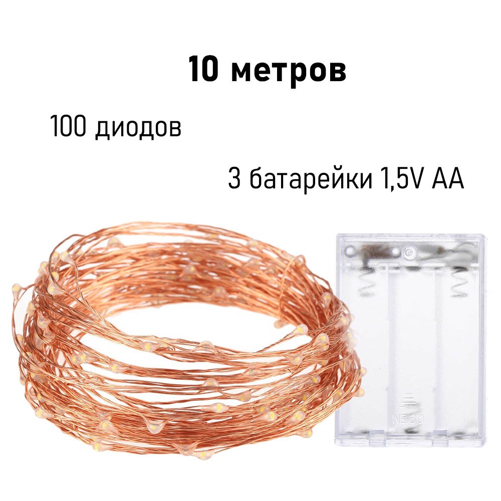 Нить "Роса" медь, 10 м х 100 диодов, от батареек, теплый белый