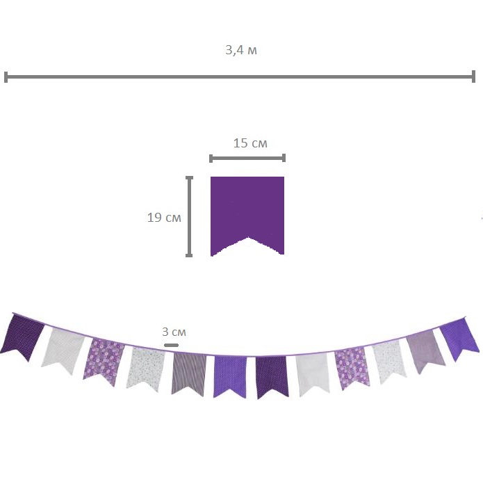 Гирлянда состоит из 12 флажков, общая длина составляет 3,4 м, расстояние между флажками 3 см, длина матерчатых флажков 2,1 м, длина лямок с обеих сторон по 50 см
