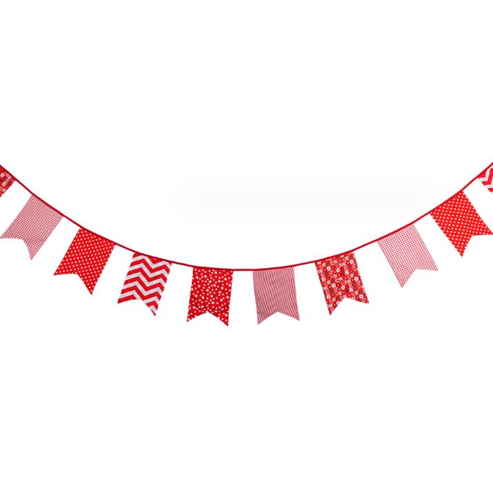 Гирлянда состоит из 12 флажков, общая длина составляет 3,4 м, расстояние между флажками 3 см, длина матерчатых флажков 2,1 м, длина лямок с обеих сторон по 50 см