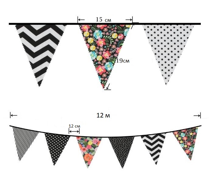 Гирлянда состоит из 42 флажков, из них длина вымпела 9 м, а длина лямок с обеих сторон 45-50 см