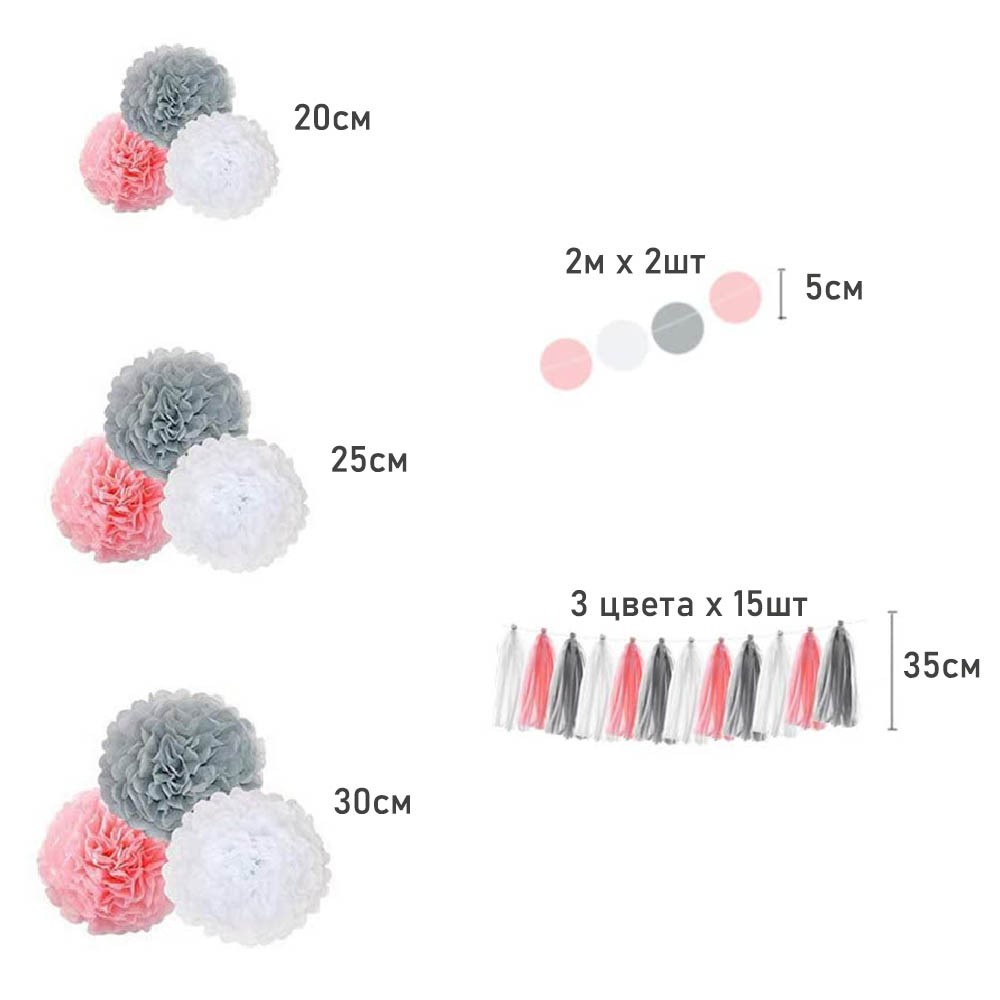 Готовый комплект из бумажных помпонов и гирлянд, можно применять в качестве декорирования фотозоны к празднику. Бумажные помпоны необходимо расправить.  Готовый набор доставляется в сложенном виде. Можно использовать несколько раз.