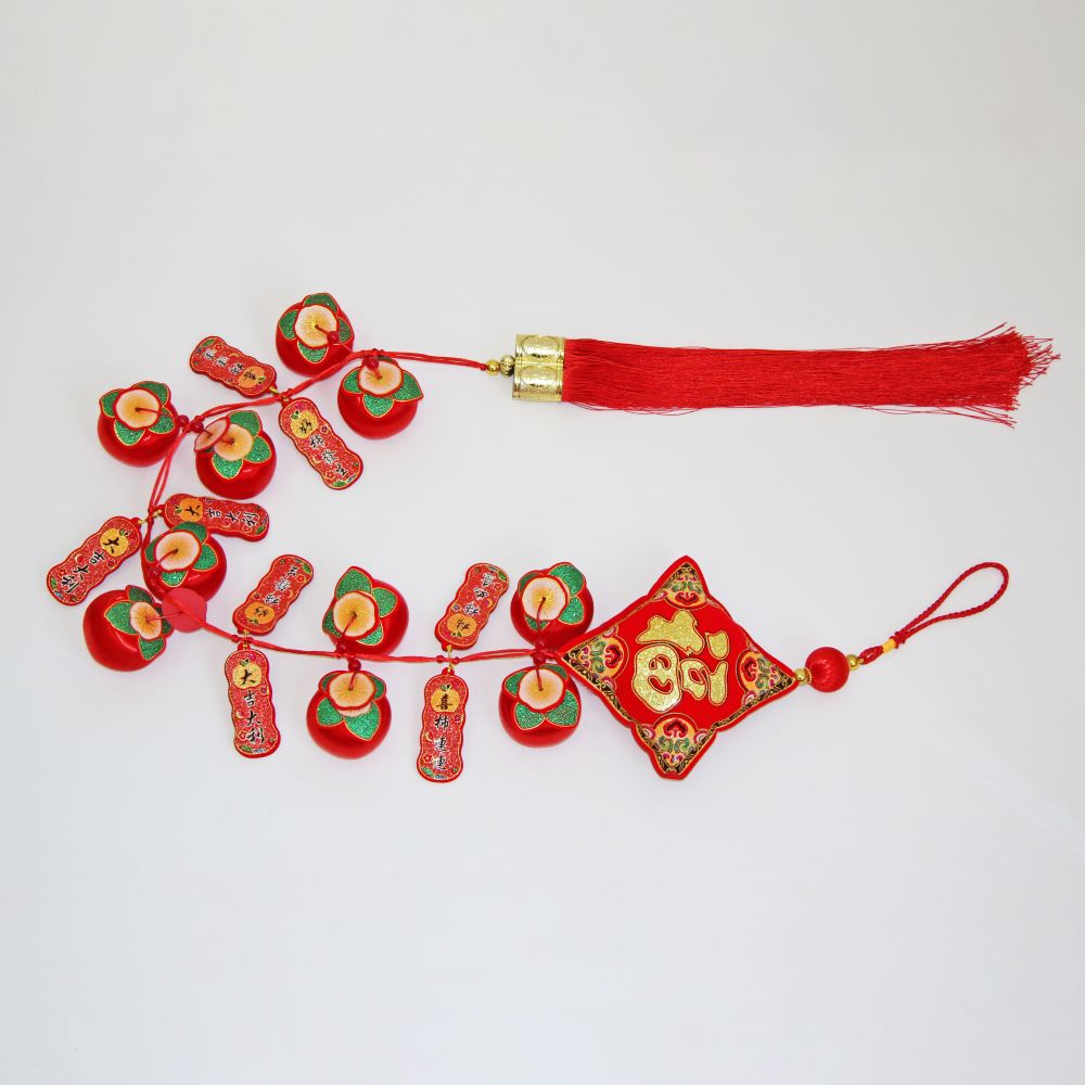 Символика подвески включает красные яблоки, которые олицетворяют гармонию, мир и процветание, иероглифы на листьях — благополучие, ромб: гармония, защита от негативной энергии и баланс (в китайской традиции геометрическая строгость формы символизирует порядок и стабильность).