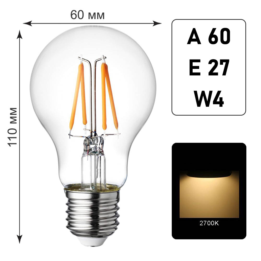 Лампа светодиодная A60 E27 W4 с теплотой свечения 2700 K.  Характеризуется высокой энергоэффективностью и потребляет до 90% меньше электричества, в сравнении с классическими лампами. Могут эксплуатироваться как внутри, так и снаружи помещений. Срок службы – до 25 000 часов. Потребляемая мощность 2 Вт/4 Вт/8 Вт.