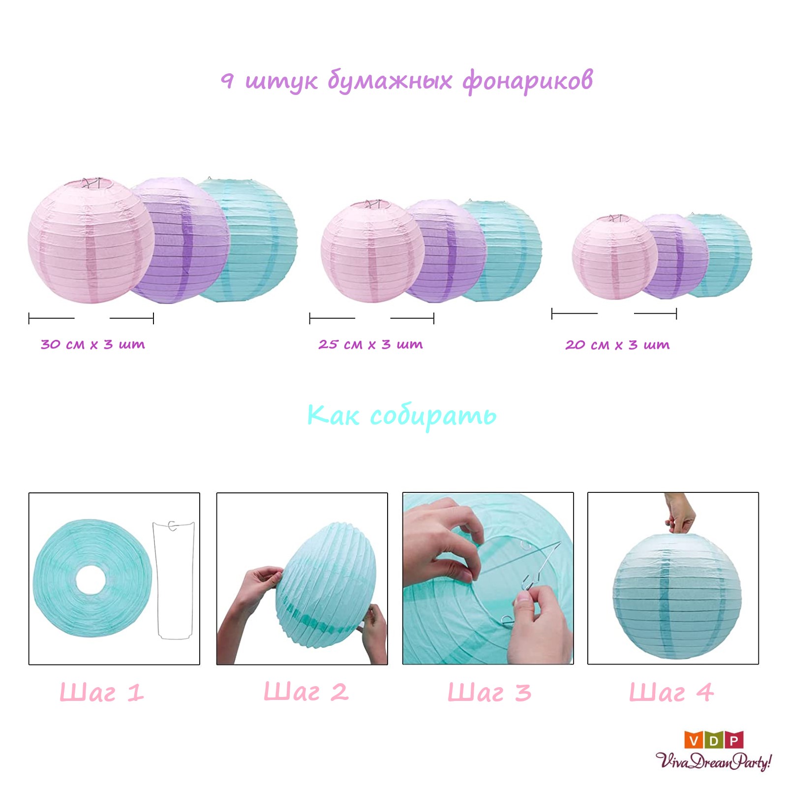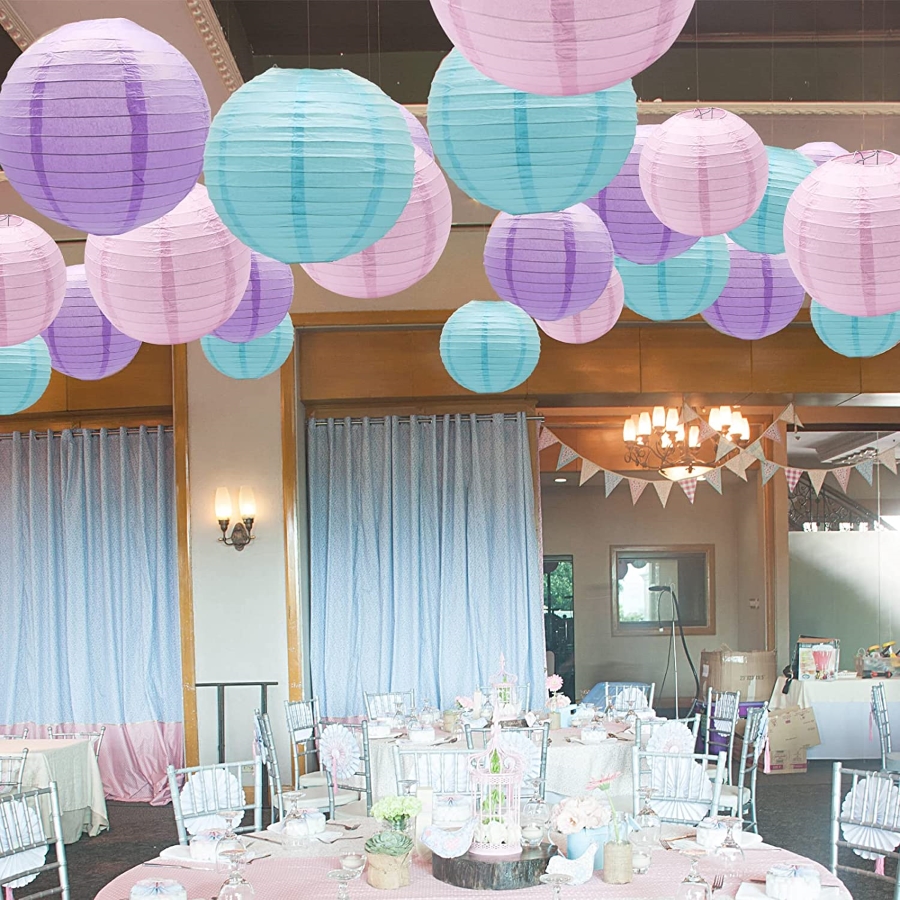 Набор подвесные фонарики 9 шт, розовый+св.сиреневый+голубой