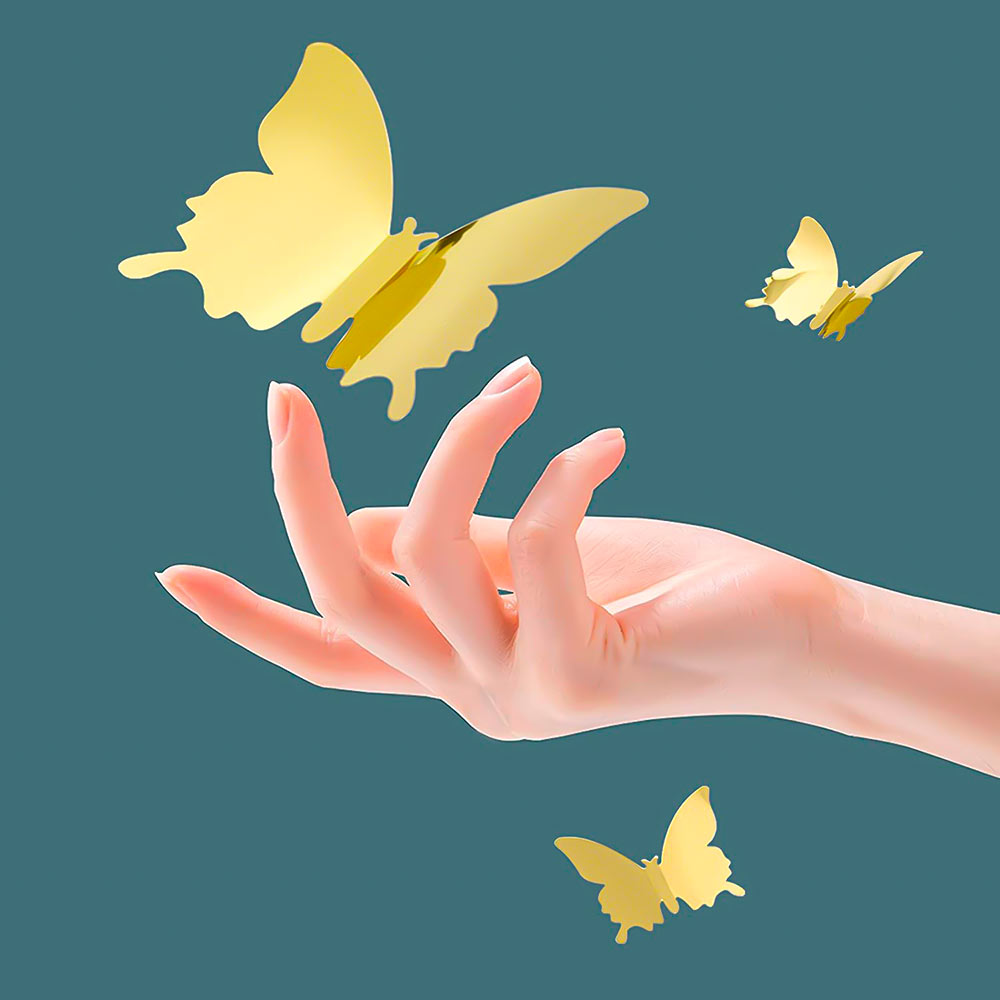 Пластиковые бабочки, двухцветные с внутреней стороны серебро, крепятся с помощью двухсторонней клейкой ленты, которая идет в комплекте.