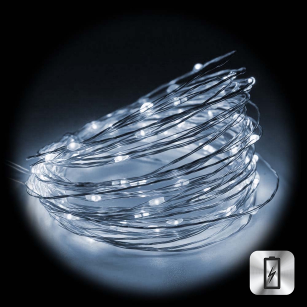 Нить "Роса" медь, 10 м х 100 диодов, от батареек, белый
