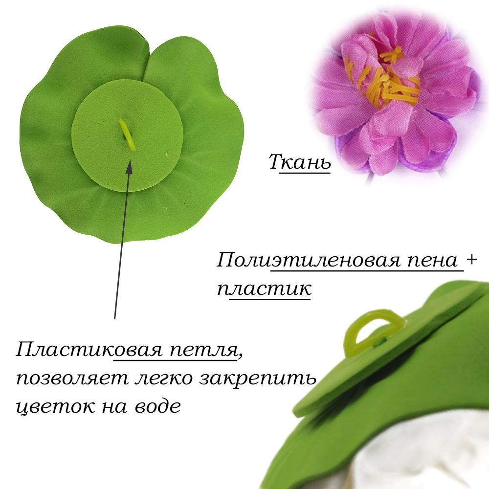 Легко плавает на воде благодаря пластиковой петле под  цветком и пенопласту.