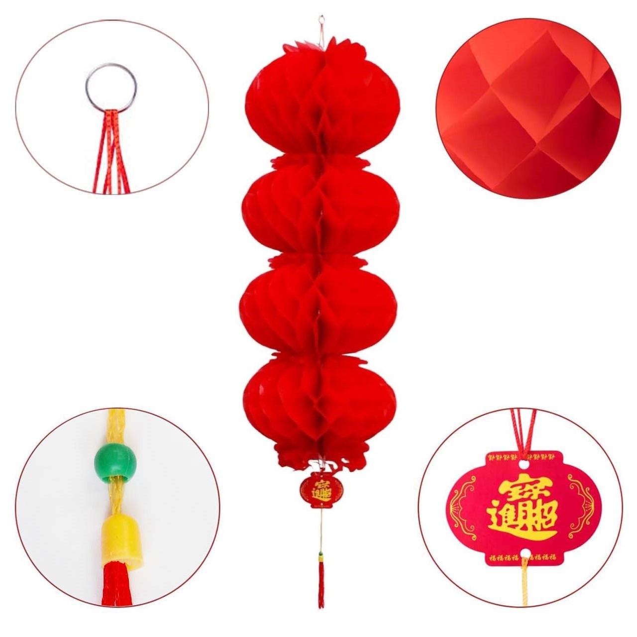 Простота в использовании: Бумажные фонарики имеют форму пчелиных сот с плотными отверстиями, их легко разворачивать и сворачивать. Раскройте концы и склейте их вместе (белая липкая двусторонняя лента на одном конце). Красный бумажный фонарь с кольцом и веревкой сверху легко подвешивается и снимается.