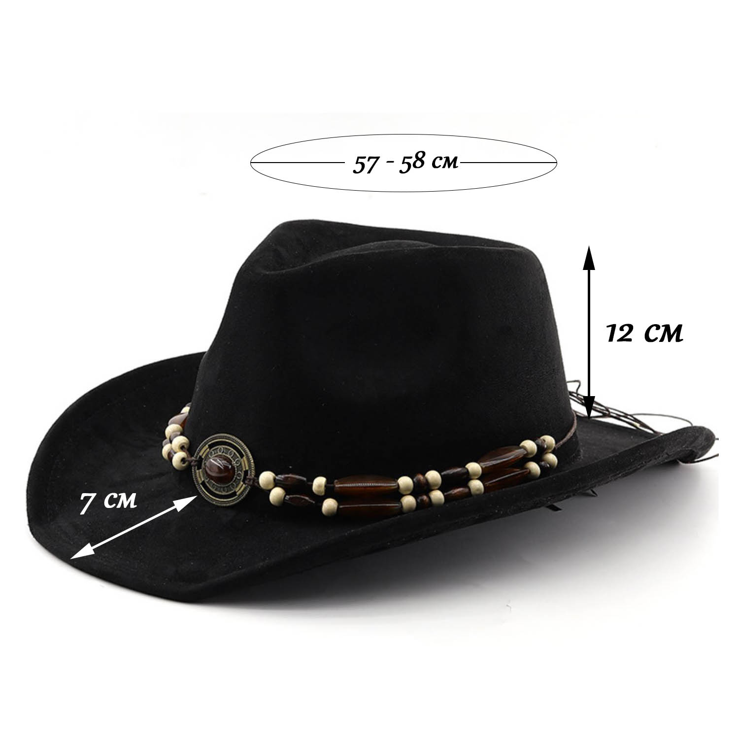 Окружность замшевой ковбойской шляпы: 57-58 см.