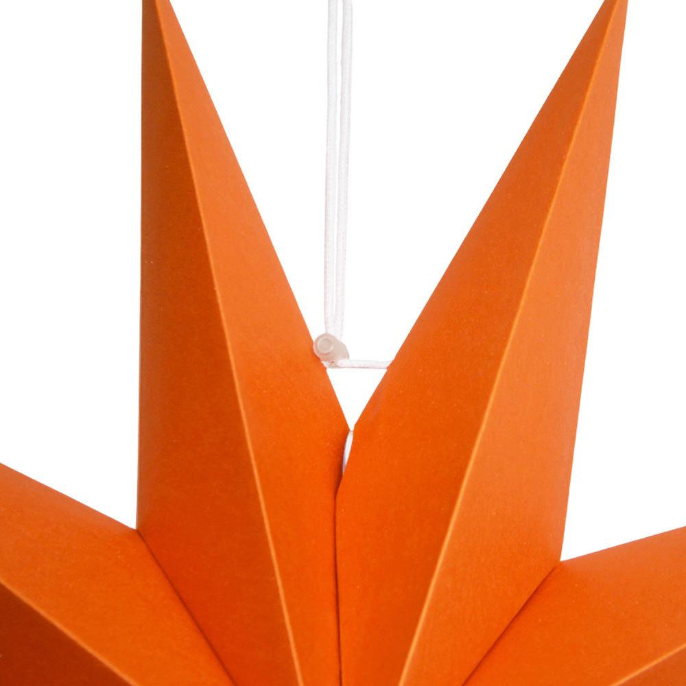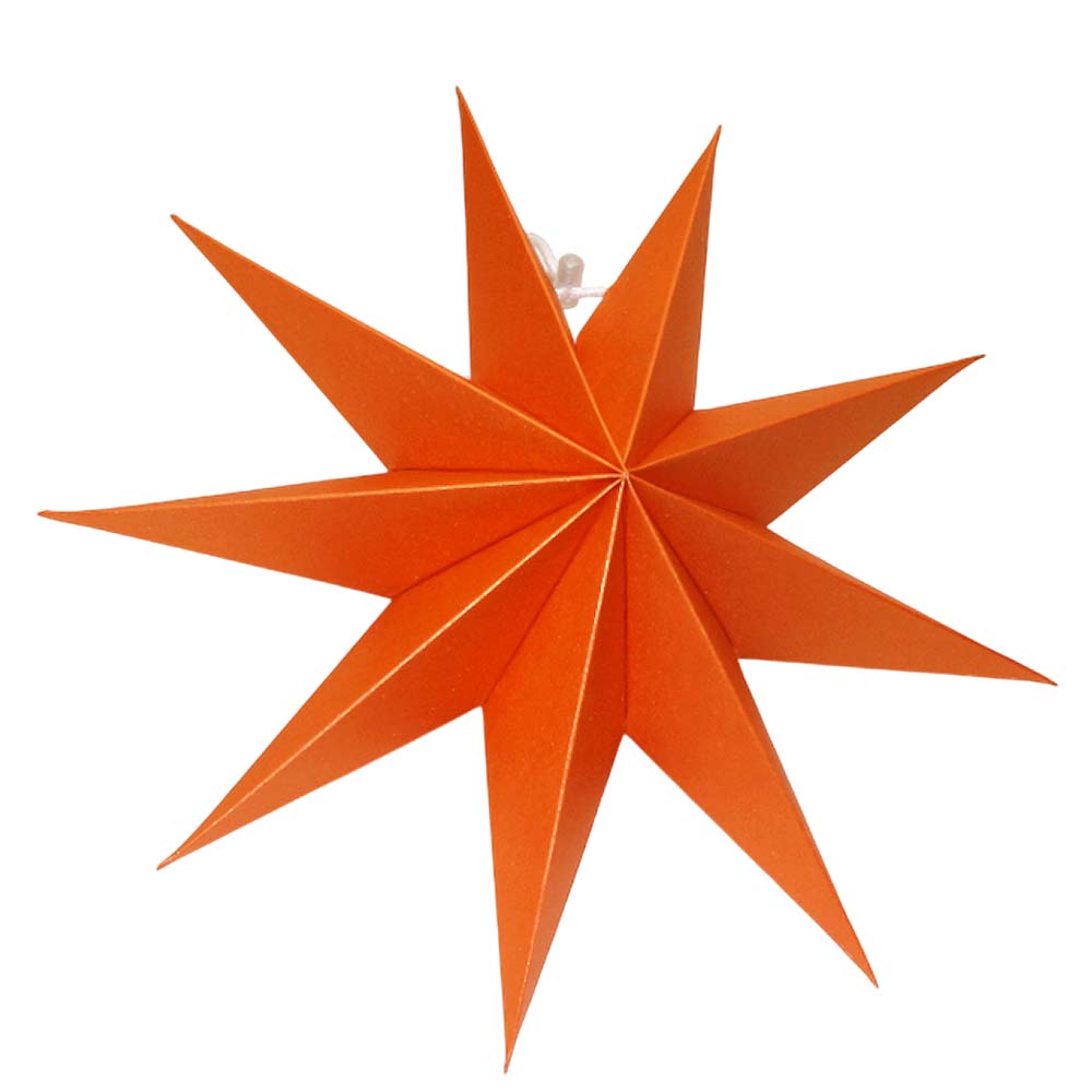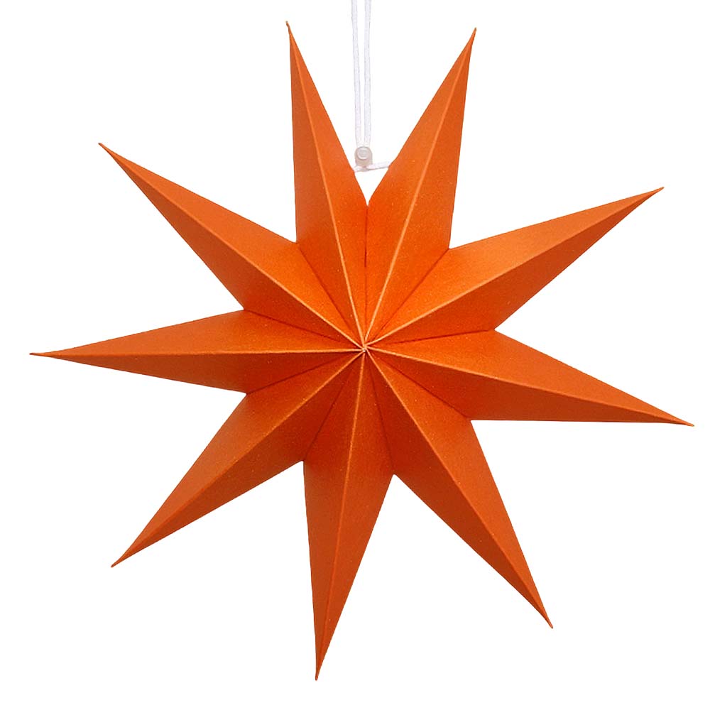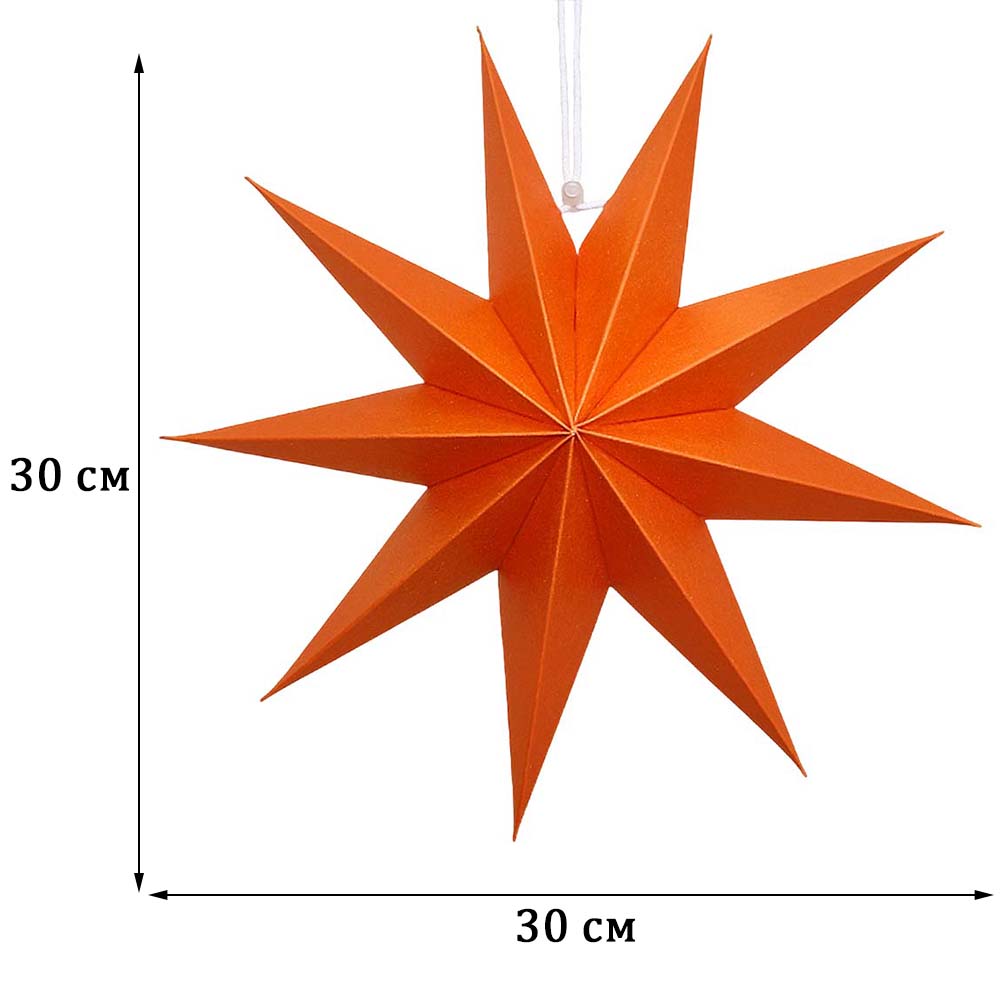 Объёмная декоративная звезда из картона диаметром 30 см с 9 лучами. Оснащена встроенным шнурком для подвешивания. Поставляется в компактном сложенном виде и быстро собирается: специальный шнурок при затягивании придаёт изделию объём и фиксирует форму. После сборки звезда остаётся устойчивой без дополнительных креплений и может использоваться многократно.