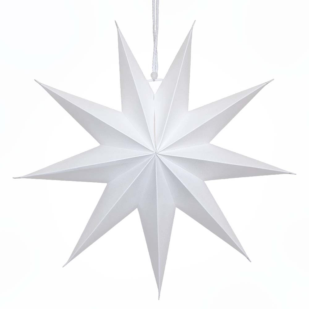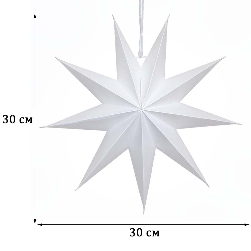 Объёмная декоративная звезда из картона диаметром 30 см с 9 лучами. Оснащена встроенным шнурком для подвешивания. Поставляется в компактном сложенном виде и быстро собирается: специальный шнурок при затягивании придаёт изделию объём и фиксирует форму. После сборки звезда остаётся устойчивой без дополнительных креплений и может использоваться многократно.