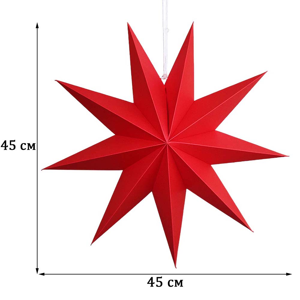 Объёмная девятиконечная звезда 45 см — декоративный элемент для интерьера и праздничного оформления. Лёгкая интерьерная звезда из картона хорошо держит форму и создаёт выразительный объём. Поставляется в сложенном виде, в комплекте шнур для фиксации объёма и подвеса.