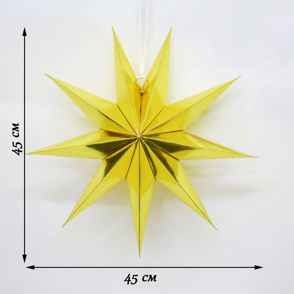 Объёмная девятиконечная звезда 45 см — декоративный элемент для интерьера и праздничного оформления. Лёгкая интерьерная звезда из картона хорошо держит форму и создаёт выразительный объём. Поставляется в сложенном виде, в комплекте шнур для фиксации объёма и подвеса.