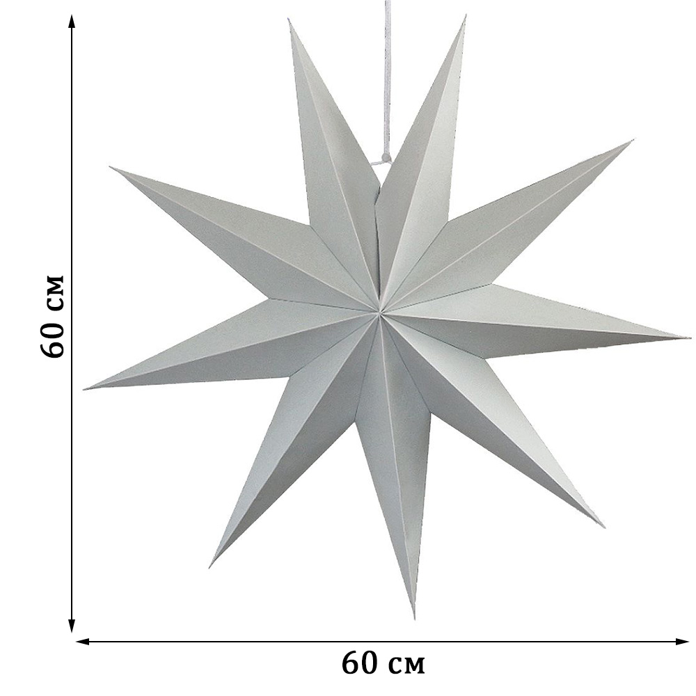 Объёмная девятиконечная звезда 60 см — декоративный элемент для интерьера и праздничного оформления. Лёгкая интерьерная звезда из картона хорошо держит форму и создаёт выразительный объём. Поставляется в сложенном виде, в комплекте шнур для фиксации объёма и подвеса.