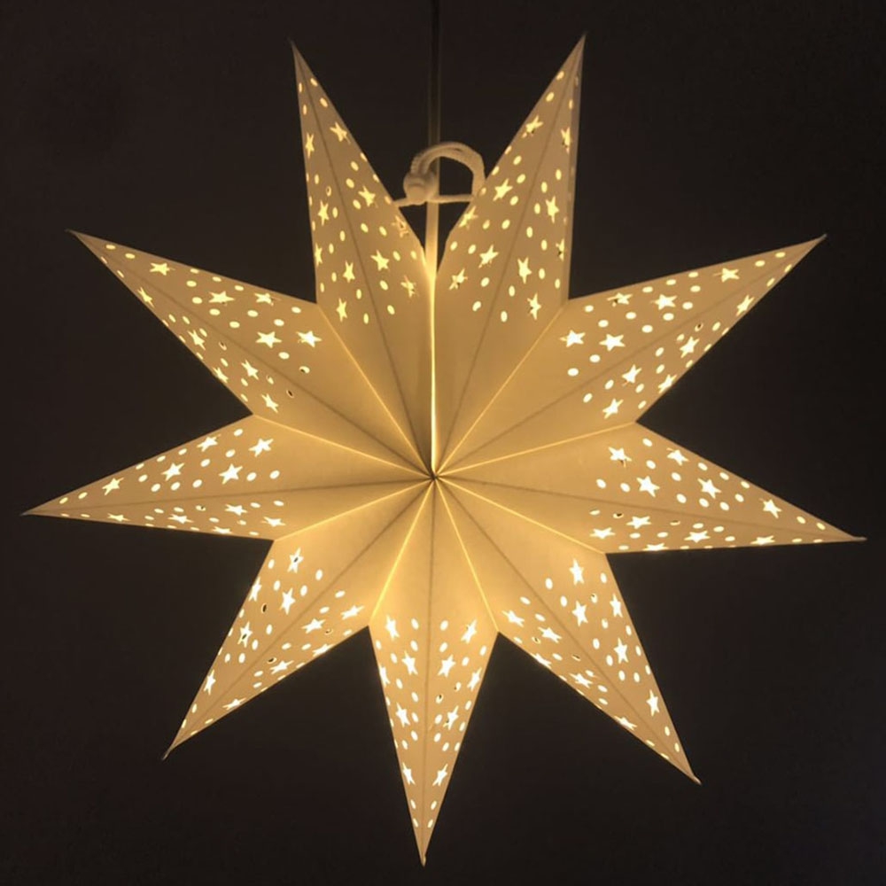 Звезда девятиконечная диаметром 35 см, изготовлена из  картона с перфорацией в виде точек и мелких звезд.