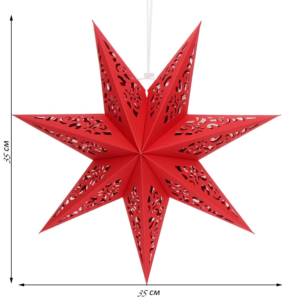 Семиконечная объемная звезда 35 см — великолепный декор из тонкого перфорированного картона. Создает красивые световые эффекты. Поставляется в сложенном виде, в комплекте шнур для фиксации объема и подвеса.